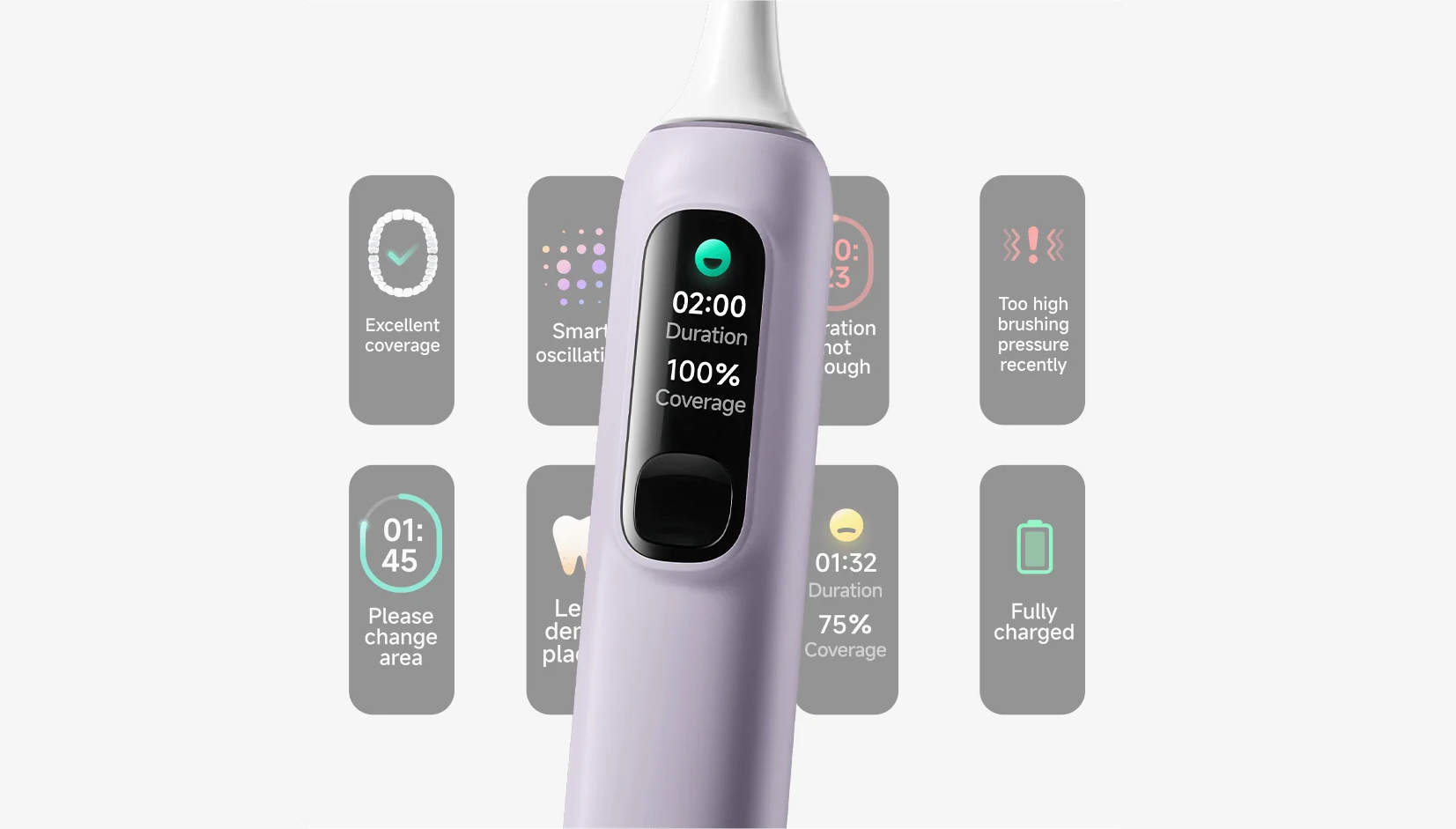 Щётка оснащена мощным мотором, создающим до 27 600 пульсаций в минуту, что обеспечивает тщательную, но мягкую чистку зубов. Овальная форма головки позволяет легко очищать труднодоступные участки, а датчик нажима контролирует давление на зубы и дёсны, предотвращая раздражение.